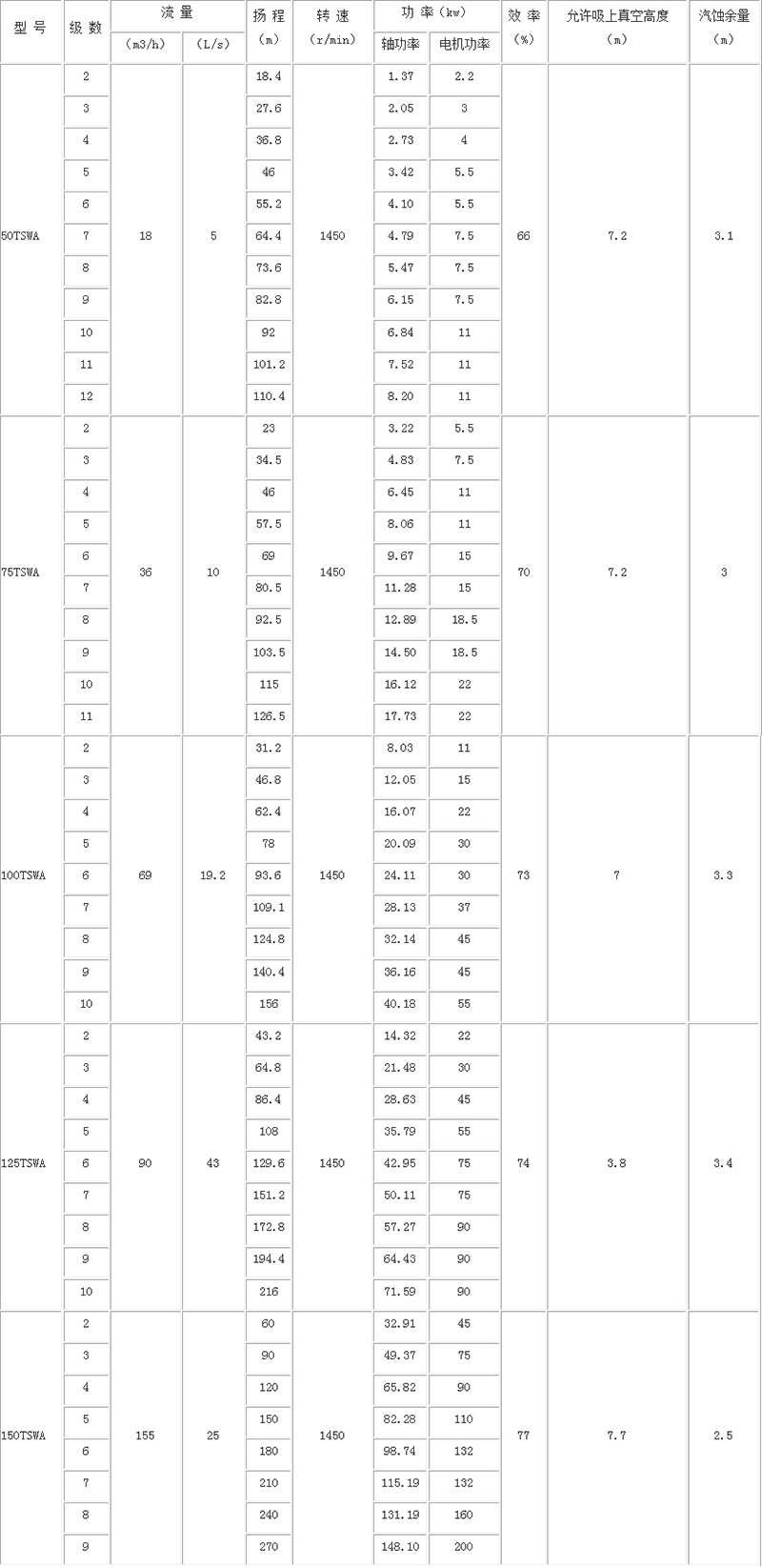 TSWA型多級離心泵系我單位開發(fā)生產的節(jié)能系列產品,具有運行噪聲低、抗汽蝕性能好、結構合理、使用壽命長等優(yōu)點。TSWA型臥式多級離心泵全系列共有5個品種40個規(guī)格,使用性能范圍:流量Q=15~199m3/h,揚程H=17~247m,轉速n=1450r/min??晒┹斔?0℃